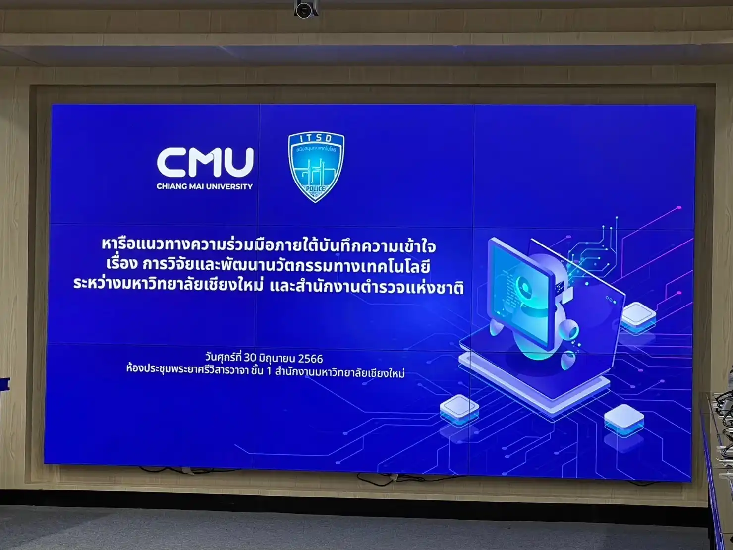 วันที่ ๓๐ มิ.ย.๖๖ พ.ต.อ.หญิง สุภัทรา ชัยรัตน์ ผกก.กลุ่มงานวิจัยและพัฒนานวัตกรรมฯพร้อมคณะฯ เข้าพบ รองศาสตราจารย์ ดร.ประเสริฐ ฤกษเกรียงไกร รองอธิการบดี มหาวิทยาลัยเชียงใหม่และผู้แทนจากคณะต่าง ๆ ของมหาวิทยาลัย เพื่อปรึกษาการจัดทำบันทึกความเข้าใจ เรื่อง การวิจัยและพัฒนานวัตกรรมทางเทคโนโลยีพร้อมการนําเสนอผลงานวิจัย และโครงการสําคัญด้านเทคโนโลยีสารสนเทศของมหาวิทยาลัยเชียงใหม่ อาทิ
